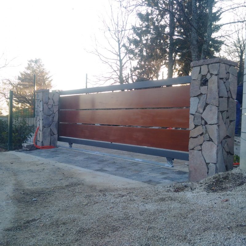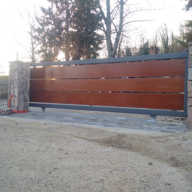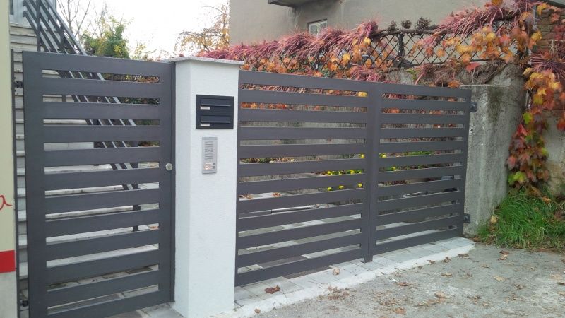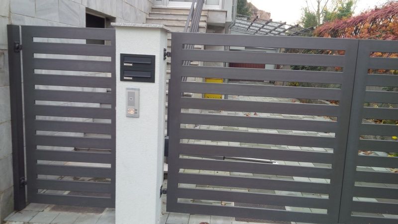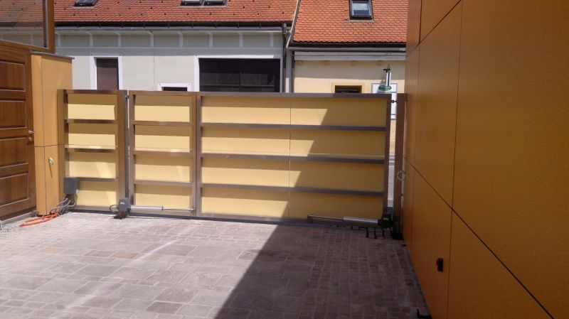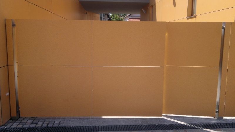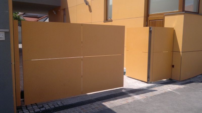 Inox dvokrilna ograda s naljepljenom fasadnom oblogom (puricelli fasadne ploče slično kao fundermax i dr.), upravljana Hormann pogonom PL, s mogučnošću otvaranja samo jednog kračeg pješačkog krila